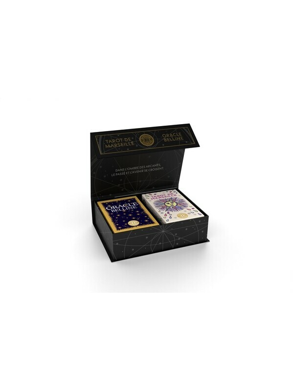Ce coffret comprend : le tarot de Marseille de Paul Marteau recolorisé de 78 cartes au format 44 x 74 mm, l’oracle de Belline de 53 cartes au format 47 x 74 mm. Ces jeux comportent une notice numérique accessible via le QR code.